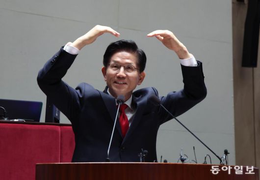 김문수 ‘손 하트’ 인사 국민의힘 김문수 후보가 9일 국회에서 열린 의원총회에 참석해 머리 위로 손 하트를 그리며 의원들에게 인사를 건네고 있다. 이훈구 기자 ufo@donga.com |