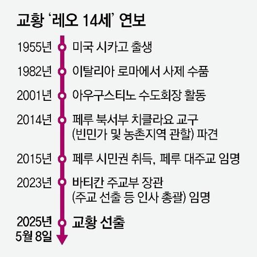 1955년 9월 14일 미국 시카고에서 태어난 레오 14세는 성 아우구스티노 수도회 출신으로 1982년 사제품을 받았다. 1985년부터 20여 년간 페루 빈민가에서 사목 활동을 해왔다. 미국 출신이지만 귀화해 페루 국적도 갖고 있다. 가난한 이주민을 위해 헌신한 전임 프란치스코 교황과 닮았다는 평가다. 2023년 전임 프란치스코 교황 때 추기경에 서임됐고, 이후 전 세계 주교 인사를 총괄하는 교황청 주교부 장관을 지냈다.