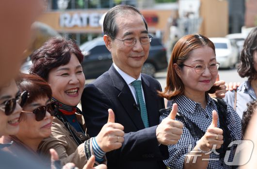 한덕수 무소속 대선 예비후보가 8일 오전 경북 구미시 박정희 전 대통령 생가를 찾아 지지자들과 기념 촬영하고 있다. 2025.5.8/뉴스1 ⓒ News1 공정식 기자 |