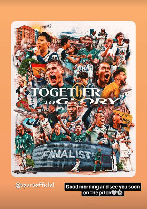 손흥민은 9일(한국시간) 본인의 사회관계망서비스(SNS) 계정을 통해 “좋은 아침이다. 곧 경기장에서 만나겠다”라는 문구를 올렸다. 소속팀 토트넘 홋스퍼가 유럽축구연맹 유로파리그(UEL) 결승에 진출한 기념 사진도 함께였다.