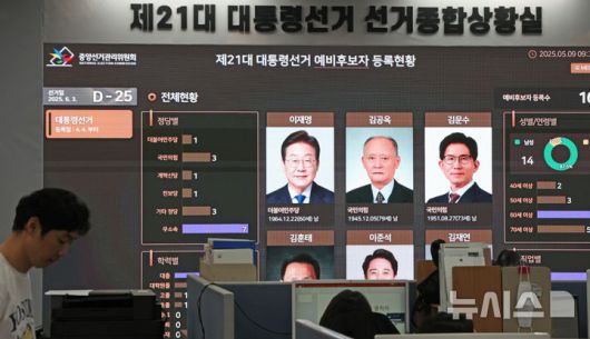 [과천=뉴시스] 김금보 기자 = 제21대 대통령선거를 25일 앞둔 9일 오전 경기 과천시 중앙선거관리위원회 선거종합상황실에 예비후보등록현황이 표시돼 있다. 2025.05.09. kgb@newsis.com |