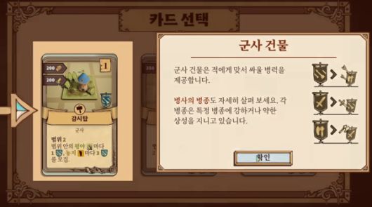 가령, '감시탑'의 경우 범위 안에 평야가 하나 있을 때마다 추가 궁병을 모집할 수 있다. 해당 스테이지에서 평야가 등장하는 비율이 적다면 감시탑은 좋은 효율을 보지 못하기 떄문에 다른 카드를 선택하는 편이 낫다.
