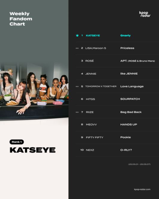 ‘케이팝레이더’ 위클리 팬덤 차트는 아티스트의 성장 지표, 특히 성장률을 분석해 매주 발표하며, 캣츠아이는 지난달 30일 발매한 새 싱글 ‘날리(Gnarly)’로 9일 공개된 해당 차트에서 정상을 차지했다.