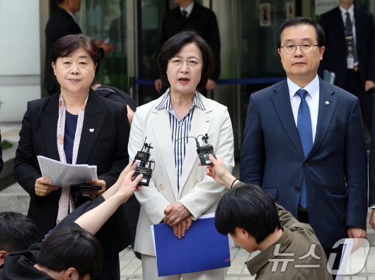 추미애 더불어민주당 윤석열 내란진상조사단장과 소속 의원들이 지난 4월 21일 오전 서울 서초구 서울중앙지방법원 앞에서 기자회견을 열고 내란 우두머리 혐의로 기소된 윤석열 전 대통령 재판이 불공정하다며 사법부를 비판하고 있다 . 2025.4.21/뉴스1 ⓒ News1 황기선 기자 |