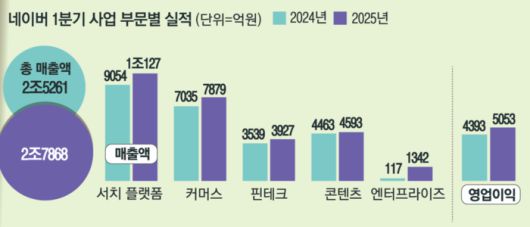 커머스는 네이버플러스 스토어 앱 출시 등에 힘입어 전년 동기 대비 12% 늘어난 7879억원의 매출을 보였고, 커머스 광고 매출은 추천 광고 고도화 등 영향으로 역대 최대 규모를 기록했다. 핀테크의 경우 지난해 같은 기간 대비 11% 올랐고, 1분기 네이버페이 결제액은 17.4% 늘어난 19조6000억원을 달성했다. 콘텐츠와 엔터프라이즈 부문 매출은 각각 2.9%, 14.7% 증가했다. 네이버는 사업 부문 특성을 고려해 기존 클라우드 부문의 명칭을 엔터프라이즈로 변경했다고 설명했다.