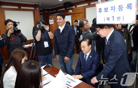 (과천=뉴스1) 김명섭 기자 = 김윤덕 더불어민주당 중앙선거대책위원회 총무본부장과 배우 이관훈씨가 10일 오전 경기도 과천시 중앙선거관리위원회에서 이재명 더불어민주당 대통령 후보자 등록을 하고 있다. 2025.5.10/뉴스1