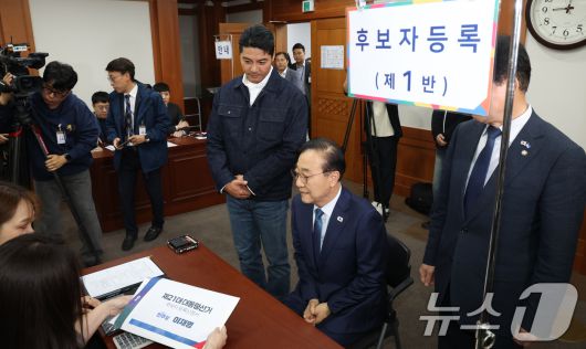 (과천=뉴스1) 김명섭 기자 = 김윤덕 더불어민주당 중앙선거대책위원회 총무본부장과 배우 이관훈씨가 10일 오전 경기도 과천시 중앙선거관리위원회에서 이재명 더불어민주당 대통령 후보자 등록을 하고 있다. 2025.5.10/뉴스1