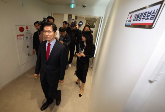 김문수 국민의힘 대선후보가 10일 오전 서울 여의도 국민의힘 중앙당사 대통령후보실에서 캠프 관계자들과 대책회의를 하기 위해 이동하고 있다. 2025.05.10. [=서울=뉴시스 |
