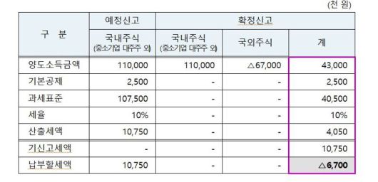 국외주식 양도차손을 국내주식 양도소득에서 차감해 확정신고 한 경우. 자료:국세청