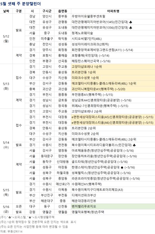 5월 셋째 주에 전국 5304가구 분양을 앞둔 가운데, 각 도시의 아파트명과 함께 일자별로 분양, 계약, 당첨 발표 일정이 기재된 분양 캘린더가 제공되고 있다. |