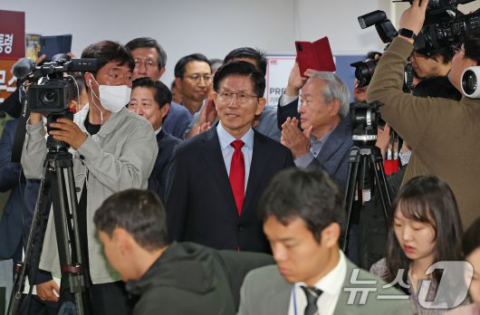 (서울=뉴스1) 장수영 기자 = 국민의힘으로부터 대통령선거 후보 자격이 취소된 김문수 후보가 10일 오전 서울 여의도에 마련된 대선 캠프 사무실에서 긴급기자회견을 하기 위해 입장하고 있다. 2025.5.10/뉴스1