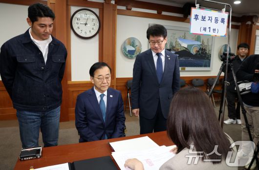 김윤덕 더불어민주당 중앙선거대책위원회 총무본부장과 배우 이관훈씨가 10일 오전 경기도 과천시 중앙선거관리위원회에서 이재명 더불어민주당 대통령 후보자 등록을 하고 있다. 2025.5.10/뉴스1 ⓒ News1 김명섭 기자 |