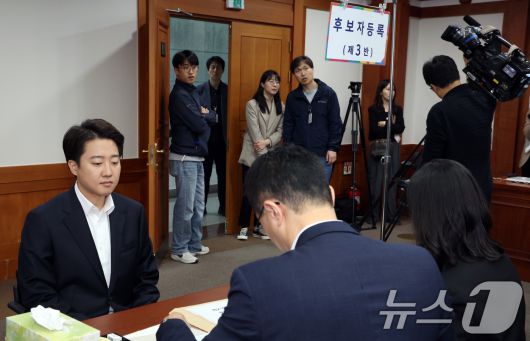 (과천=뉴스1) 김명섭 기자 = 이준석 제21대 대통령 선거 개혁신당 후보가 10일 오전 경기도 과천시 중앙선거관리위원회에서 후보자 등록을 하고 있다. 2025.5.10/뉴스1