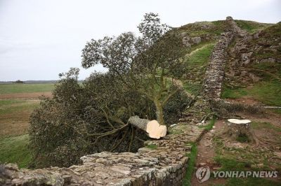 2023년 9월 시카모어 갭 나무가 절단돼 하드리아누스 방벽 위로 넘어간 모습 연합뉴스 |