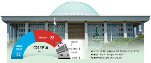 아시아투데이가 한국여론평판연구소(KOPRA)에 의뢰해 지난 9일 전국 만 18세 이상 남녀 2001명을 대상으로 실시한 '정당 지지도' 여론조사 결과에 따르면, 더불어민주당은 42%로 선두를 달렸고, 국민의힘은 35%였다. 지난 1일 대법원의 이재명 더불어민주당 대선 후보의 공직선거법 위반 사건 파기환송 판결 이후 외려 지지층을 응집하게 만드는 촉매로 작용한 것이란 분석이다.