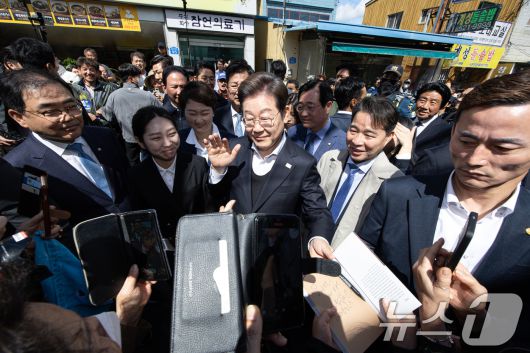 (창녕=뉴스1) 이재명 기자 = 경청투어에 나선 이재명 더불어민주당 대통령 후보가 10일 오전 경남 창녕군 창녕읍 창녕정기시장에서 시민들과 인사를 나누고 있다. 2025.5.10/뉴스1