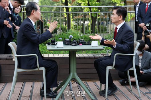 김문수 국민의힘 대선후보(오른쪽)와 한덕수 무소속 후보가 8일 국회 사랑재앞 카페에서 단독 면담하고 있다. 박민규 선임기자 |