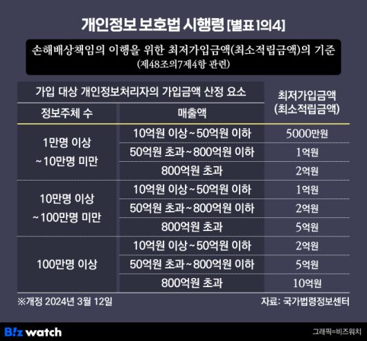 우선 개인정보보호배상책임보험이란 기업이나 단체가 개인정보 유출 등으로 발생하는 손해배상책임 등을 보장하는 보험입니다. 개인정보보호법 시행령 제48조의7에 따르면 '매출액 10억원 이상·정보주체수 일평균 1만명 이상'이면 '개인정보 손해배상책임 보장제도' 의무 대상으로 보험·공제에 가입하거나, 준비금을 적립해야 합니다.