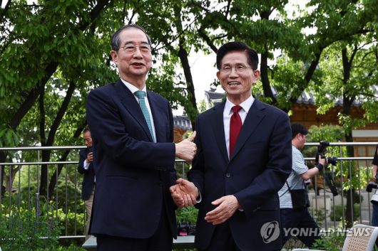 김문수 국민의힘 대선후보와 한덕수 무소속 대선 예비후보가 지난 8일 서울 국회 사랑재에 위치한 커피숍에서 만나 기념 촬영하고 있다. [사진 출처 = 연합뉴스] |