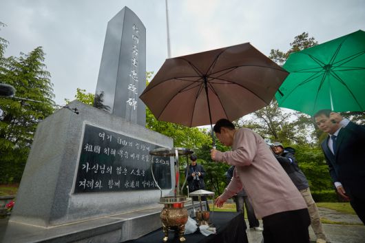 이 후보가 이날 참배한 구국용사충혼비에는 '여기 자유의 제단에 조국 위해 목숨 바친 영령을 모시노라. 가신 님의 짧은 인생은 겨례와 함께 영원히 살아가리'라고 적혀있다.
