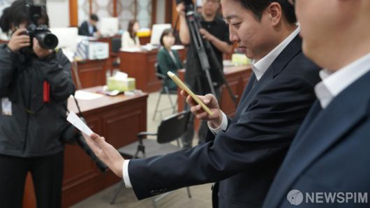 [서울=뉴스핌] 이준석 개혁신당 대선 후보가 10일 오전 경기 과천시 중앙선거관리위원회에서 후보자 등록을 마치고 후보자등록 신청서류 접수 및 기탁금 영수증을 촬영하고 있다. 있다. [사진=이준석 캠프] 2025.05.10 photo@newspim.com