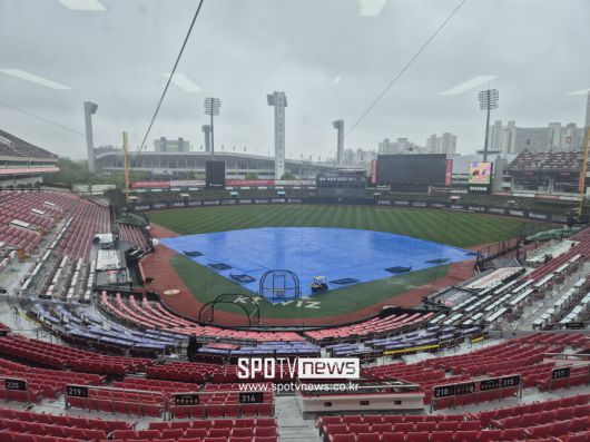 오전 11시 30분 현재, 수원 KT위즈파크에는 대형 방수포가 설치된 상태로 많은 양의 비가 내리고 있다. 오후 5시에 예정된 경기의 개최 여부는 아직 미정이다.