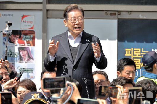 [창녕=뉴시스] 조성우 기자 = 민심을 청취하는 '경청 투어'에 나선 이재명 더불어민주당 대선후보가 10일 경남 창녕군 창녕시장 인근에서 즉흥 연설을 하고 있다. 2025.05.10. xconfind@newsis.com |