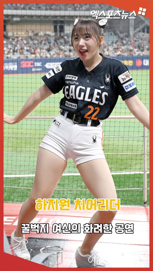 (엑스포츠뉴스 고척, 김한준 기자) 9일 오후 서울 구로구 고척스카이돔에서 열린 '2025 신한 SOL Bank KBO리그' 한화 이글스와 키움 히어로즈의 경기, 한화 하지원 치어리더가 멋진 공연을 선보이고 있다.김한준 기자 kowel@xportsnews.com