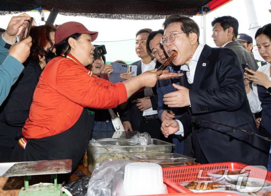 (함안=뉴스1) 이재명 기자 = 경청투어에 나선 이재명 더불어민주당 대통령 후보가 10일 오전 경남 함안군 가야읍 가야시장에서 김치를 맛보고 있다. 2025.5.10/뉴스12expulsion@news1.krCopyright ⓒ 뉴스1. All rights reserved. 무단 전재 및 재배포, AI학습 이용 금지.