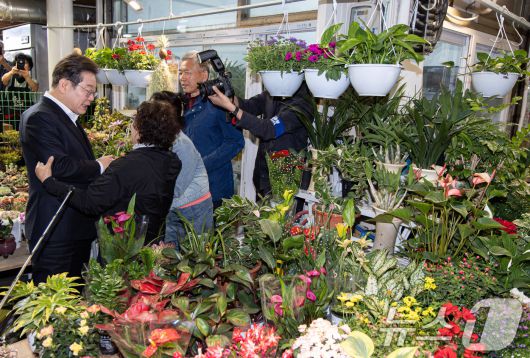 (함안=뉴스1) 이재명 기자 = 경청투어에 나선 이재명 더불어민주당 대통령 후보가 10일 오전 경남 함안군 가야읍 가야시장에서 상인들과 대화를 나누고 있다. 2025.5.10/뉴스1