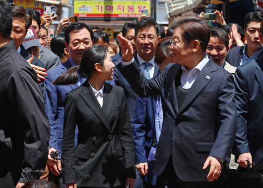 영남 신라벨트 골목골목 경청투어에 나선 더불어민주당 이재명 대선 후보가 10일 경남 함안군 가야전통시장을 찾아 지지자들에게 인사하고 있다. 연합뉴스 |