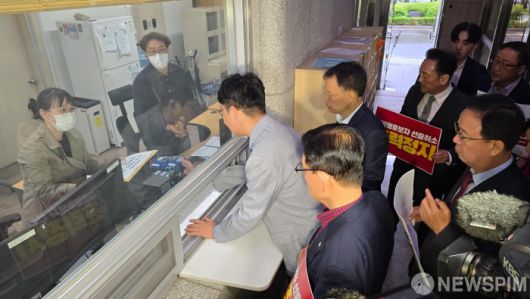 [서울=뉴스핌] 김문수 국민의힘 대선 후보 캠프 관계자들이 10일 서울 양천구 남부지방법원에서 21대 대통령 후보자 선출취소 효력정지 가처분 신청서를 제출하고 있다. [사진=김문수 캠프] 2025.05.10 photo@newspim.com