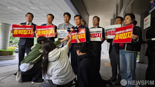 [서울=뉴스핌] 김문수 국민의힘 대선 후보 캠프 관계자들이 10일 서울 양천구 남부지방법원에서 21대 대통령 후보자 선출취소 효력정지 가처분 신청서 제출에 앞서 입장을 밝히고 있다. [사진=김문수 캠프] 2025.05.10 photo@newspim.com