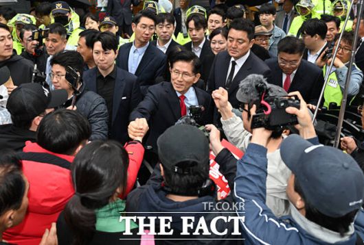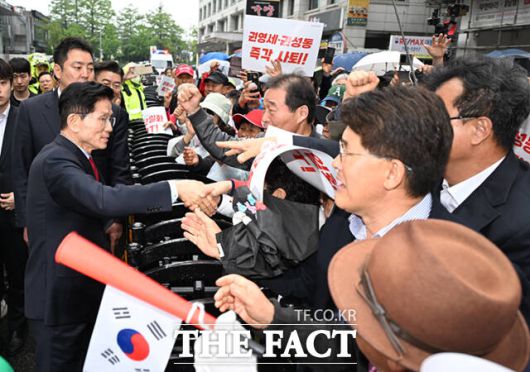 [더팩트ㅣ이새롬 기자] 김문수 국민의힘 대선 후보가 10일 서울 여의도 국민의힘 중앙당사에서 나와 지지자들과 인사하고 있다.