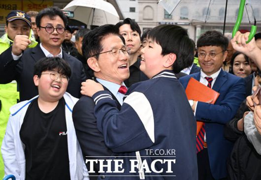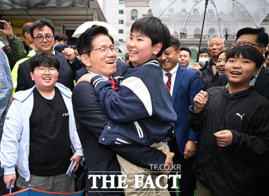 김문수 국민의힘 대선 후보가 10일 서울 여의도 국민의힘 중앙당사에서 나와 지지자들과 인사하는 도중 한 어린이를 안아올리고 있다. /이새롬 기자 |