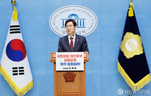 [서울=뉴스핌] 윤창빈 기자 = 조경태 국민의힘 의원이 10일 오후 서울 여의도 국회에서 한덕수 대선 예비후보의 사퇴를 촉구하는 기자회견을 하고 있다. 2025.05.10 pangbin@newspim.com