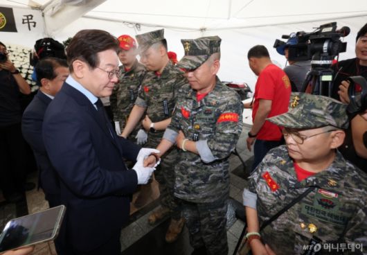 [서울=뉴시스] 황준선 기자 = 이재명 더불어민주당 전 대표가 18일 오전 서울 중구 청계광장에 마련된 故채수근 상병 순직 1주기 추모 시민분향소를 찾아 해병대 예비역 단체원들과 인사하고 있다. 2024.07.18. hwang@newsis.com /사진=황준선 |