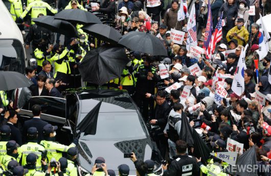 [서울=뉴스핌] 윤창빈 기자 = 국민의힘에 입당한 한덕수 대선 예비후보가 10일 오후 서울 여의도 국민의힘 중앙당사에서 현안관련 긴급 기자회견을 하기 위해 들어서고 있는 가운데 김문수 후보 지지자들이 항의하고 있다. 2025.05.10 pangbin@newspim.com