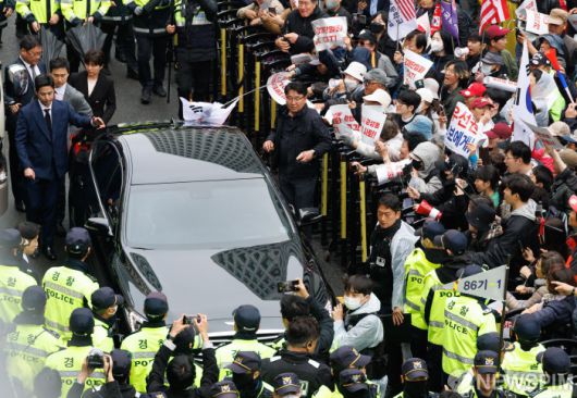[서울=뉴스핌] 윤창빈 기자 = 국민의힘에 입당한 한덕수 대선 예비후보가 10일 오후 서울 여의도 국민의힘 중앙당사에서 현안관련 긴급 기자회견을 하기 위해 들어서고 있는 가운데 김문수 후보 지지자들이 항의하고 있다. 2025.05.10 pangbin@newspim.com