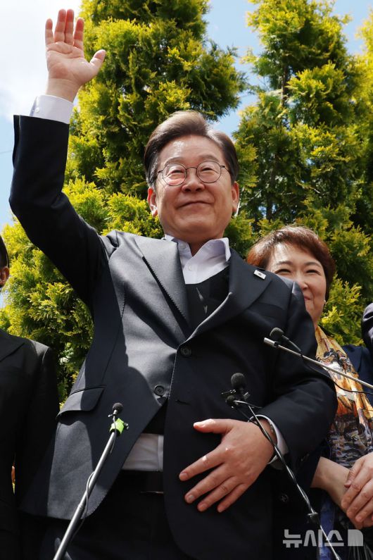 [함안=뉴시스] 조성우 기자 = 민심을 청취하는 '경청 투어'에 나선 이재명 더불어민주당 대선후보가 10일 경남 함안군 가야시장에서 즉흥 연설을 하며 손을 흔들어 군민들에게 인사하고 있다. 2025.05.10. xconfind@newsis.com |