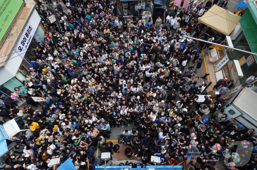 (진주=뉴스1) 이재명 기자 = 경청투어에 나선 이재명 더불어민주당 대통령 후보가 10일 오후 경남 진주시 로데오거리에서 연설을 하고 있다. (공동취재)