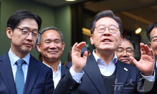 (진주=뉴스1) 이재명 기자 = 경청투어에 나선 이재명 더불어민주당 대통령 후보가 10일 오후 경남 진주시 로데오거리에서 연설을 하고 있다. (공동취재)
