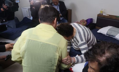 (산청=연합뉴스) 김동민 기자 = 더불어민주당 이재명 대표가 28일 오후 경남 산청군 시천면 산청 화재 이재민 대피소인 한국선비문화연구원을 찾아 이재민을 위로하고 있다. 이 대표 상의에 방탄 조끼가 보인다. 2025.3.28 image@yna.co.kr |