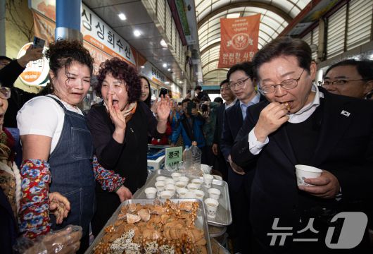 (사천=뉴스1) 이재명 기자 = 경청투어에 나선 이재명 더불어민주당 대통령 후보가 10일 오후 경남 사천시 사천읍시장에서 과자를 맛보고 있다. 2025.5.10/뉴스12expulsion@news1.krCopyright ⓒ 뉴스1. All rights reserved. 무단 전재 및 재배포, AI학습 이용 금지.