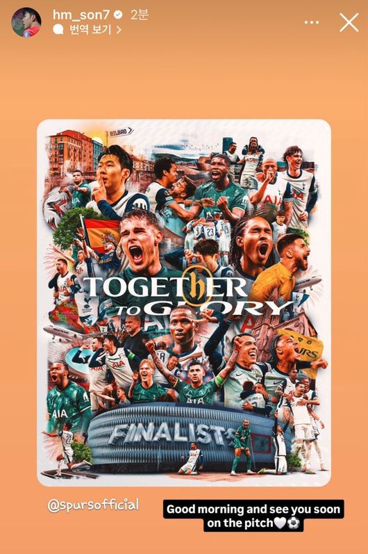 손흥민은 9일(이하 한국시간) 자신의 소셜 미디어를 통해 토트넘의 UEL 결승 진출 기념 이미지를 공유하며 "Good morning and see you soon on the pitch(좋은 아침입니다. 곧 경기장에서 만나요)"라는 짧은 메시지를 남겼다.