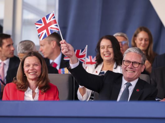▲8일(현지시간) 키어 스타머 영국 총리(오른쪽)가 배우자 빅토리아 스타머와 함께 영국 런던에서 열린 전승절 80주년 기념 행사에 참석해 영국 국기를 흔들고 있다. ⓒAP=연합뉴스 |