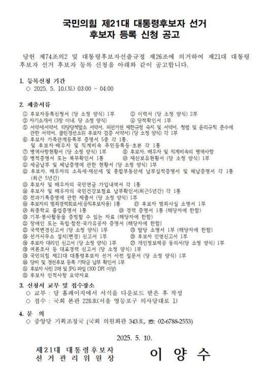 ‘후보자등록신청서(당 소정 양식) 1부, 이력서(당 소정 양식) 2부, 자기소개서(3장 이내, 당 소정 양식), 당적 확인서 1부, 후보자 및 배우자의 국민건강보험료 납부확인서(최근 5년간) 각 1통, 여론조사 등 대표경력 신고서 (당 소정 양식) 1부…’