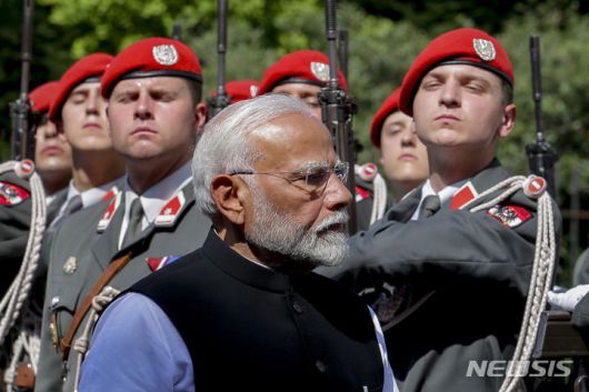 [빈=AP/뉴시스] ??인도와 파키스탄 간 군사적 긴장이 고조되며 전면전 우려가 커지는 가운데, 나렌드라 모디 인도 총리가 군 수뇌부를 소집해 대책회의를 열였다. 사진은 모디 총리가 지난해 7월 10일(현지시각) 오스트리아 빈에서 의장대를 사열하는 모습. 2025.05.10 |