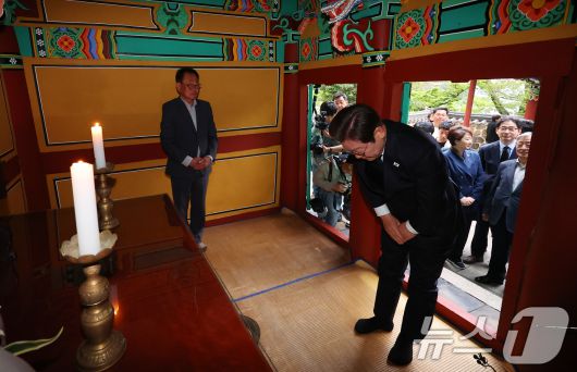 (남해=뉴스1) 이재명 기자 = 경청투어에 나선 이재명 더불어민주당 대통령 후보가 10일 오후 경남 남해군 충렬사를 찾아 이순신 장군 사당을 참배하고 있다. (공동취재) 2025.5.10/뉴스1
