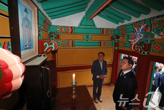 (남해=뉴스1) 이재명 기자 = 경청투어에 나선 이재명 더불어민주당 대통령 후보가 10일 오후 경남 남해군 충렬사를 찾아 이순신 장군 사당을 참배하고 있다. (공동취재) 2025.5.10/뉴스1